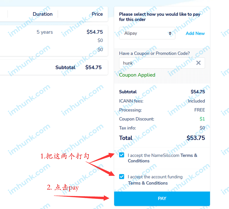 Duration:购买时长,可以点击那个小三角进行增加,建议选择3-5年,时间长一点,免得忘了。Hunk的圈子里每年都会有忘了续费而导致域名被其他人抢注的案例,非常可惜。所以建议一次性多买几年,一年也就几十块RMB,也不贵。