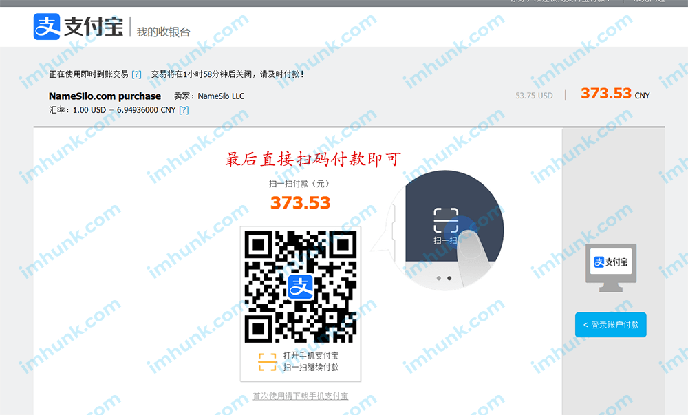 接下来就会出来一个支付宝二维码,然后扫码支付即可。它这里的价格是USD,后面你银行会换算成RMB,你到时候直接支出或还款RMB即可。