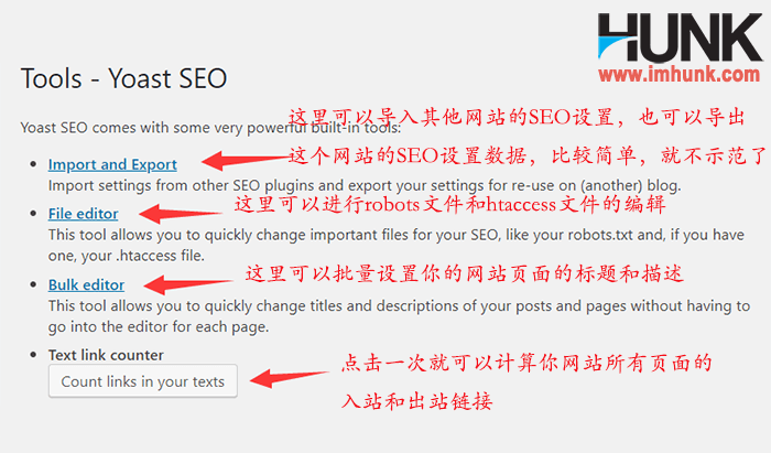 你可以在这里去导出你现有网站的seo的设置,也可以导入其他网站的seo的设置,比较简单,我就不示范了。